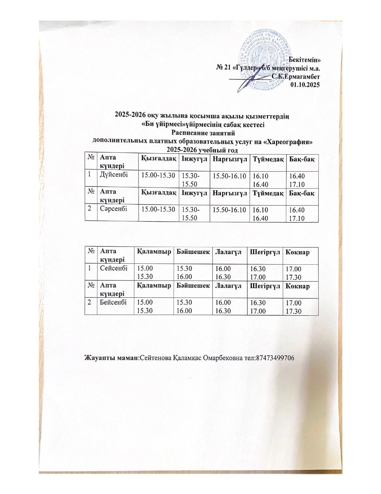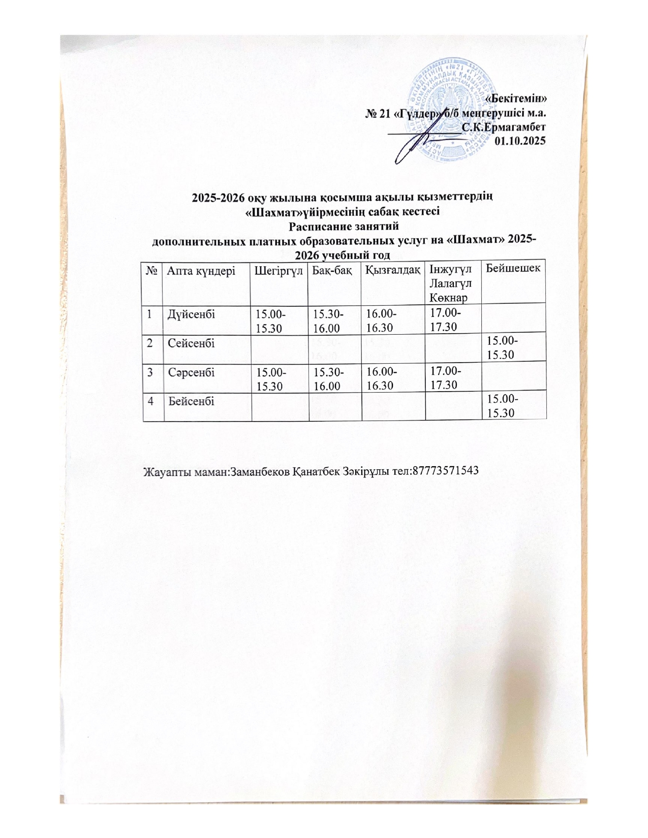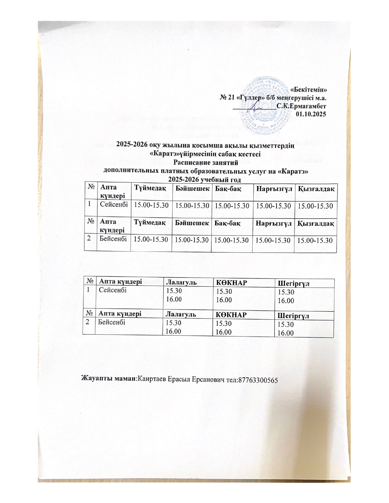 2025-2026 оқу жылына қосымша ақылы қызметтердің сабақ кестесі